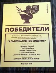 In Barnaul, the awarding ceremony of the Siberian Festival of Non-Profit Social Video Advertising to promote a healthy lifestyle and an active civic position, “Alternative Vision” was held. The winner in the nomination “The Best Social Video” was the team of the Children's health camp “Cape Verde”, which included director and scriptwriter? undergraduate student of the faculty of history and philology (FHP) of the TSPU Gleb Balabaev. Sergey Dushkin was cinematographer and Maria Syrenkova provided offscreen commentary.