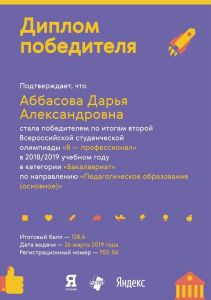 The future teacher of foreign languages, a student of the TSPU, Darya Abbasova, became the winner of the second All-Russian Student Contest "I am a professional" in the category "Bachelor" in the direction of "Pedagogical education (basic)".